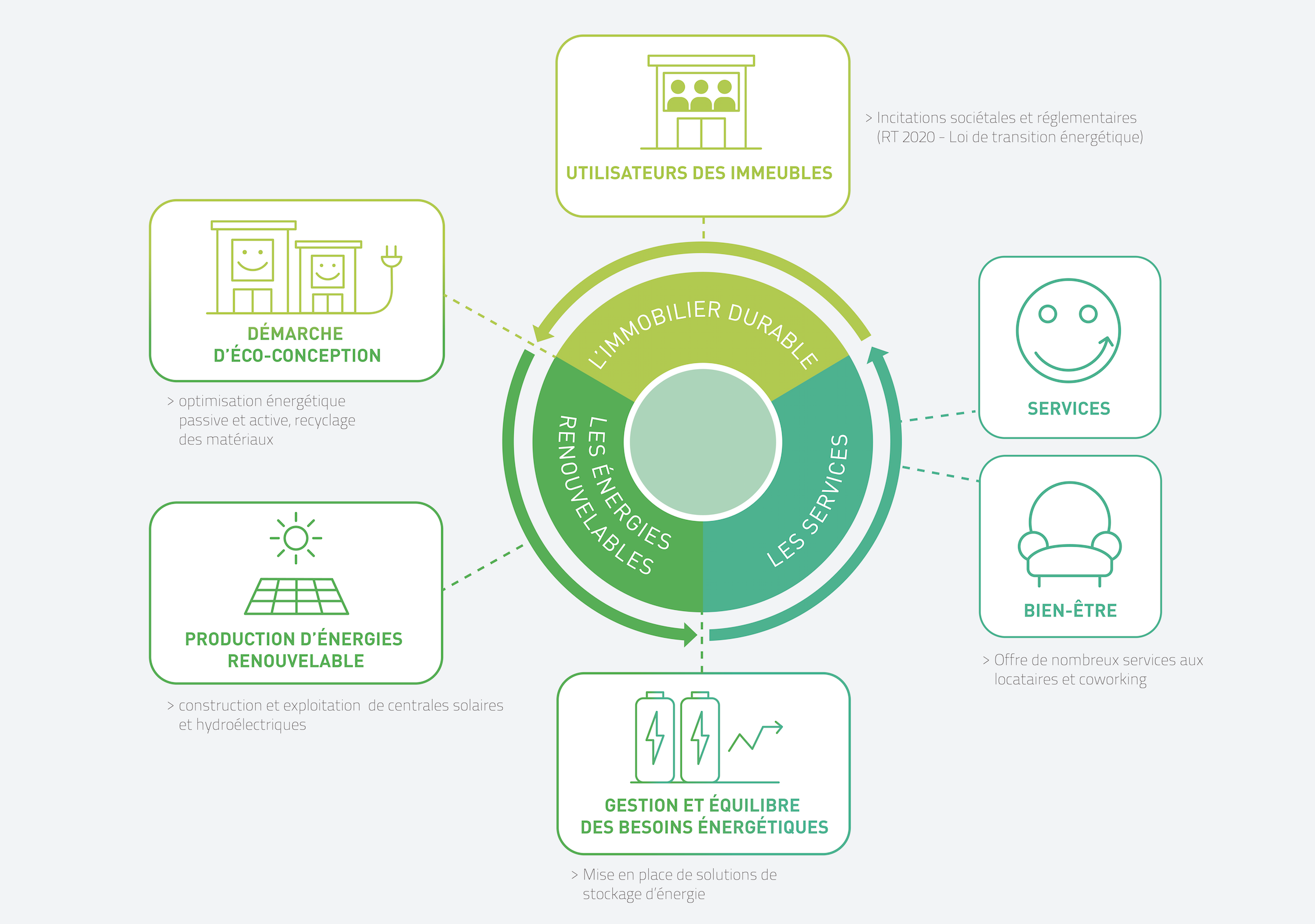• Nous sommes un acteur pionnier de la transition énergétique. Ceci nous a amené à devenir le seul acteur de l’immobilier en France, à la fois producteur et fournisseur d’énergie 100 % renouvelable au service de ses clients.