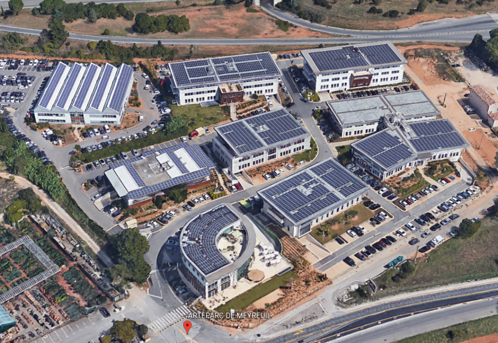 L’Arteparc Meyreuil réunit 6 bâtiments, cumulant une puissance totale de 492 kWc. Mises en services à partir de 2010, ce sont des centrales photovoltaïques de première génération : en vente totale. Elles produisent jusqu’à 615 MWh par an.