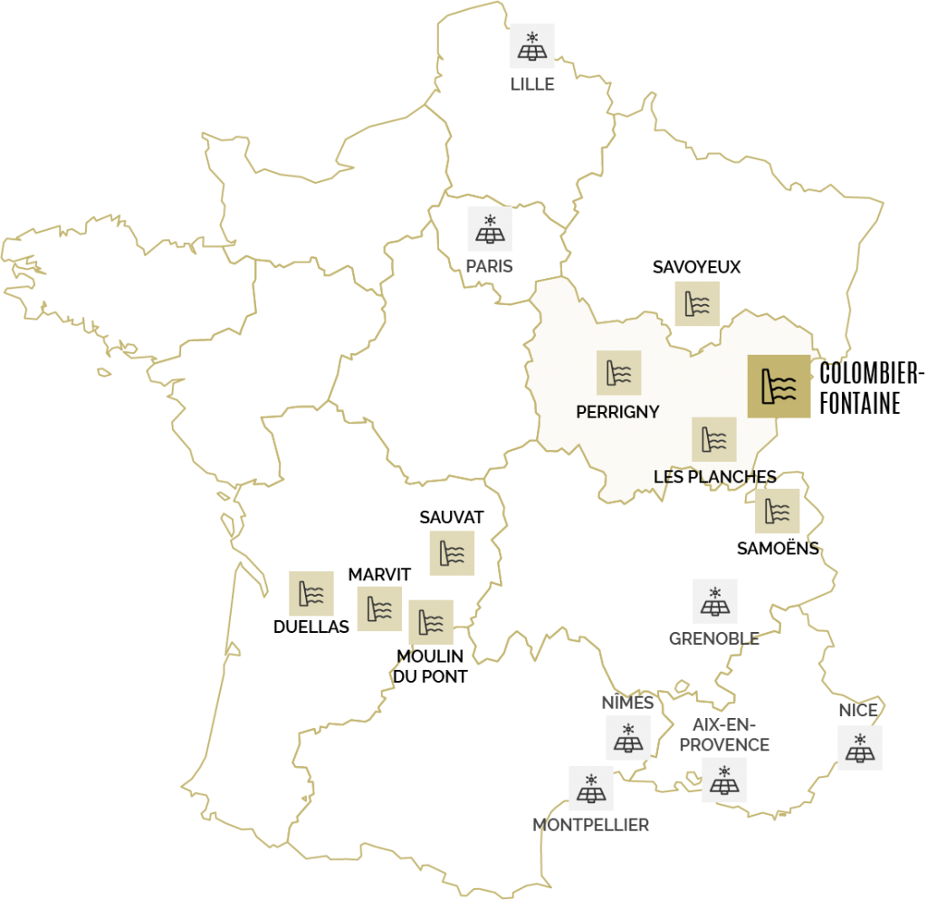 Initialement issu de la transformation de l’ancien Moulin Rayot en filature, la centrale de Colombier-Fontaine est installée sur un ancien complexe industriel. En 2016 les équipes d’ARTEA ont rénové la centrale en modifiant la prise d’eau, installant un 4ème groupe et en modernisant l’ensemble des installations électriques et l’automatisation du site.